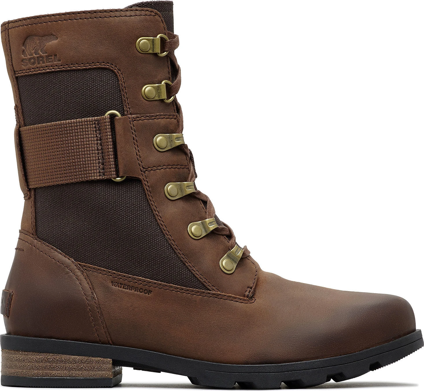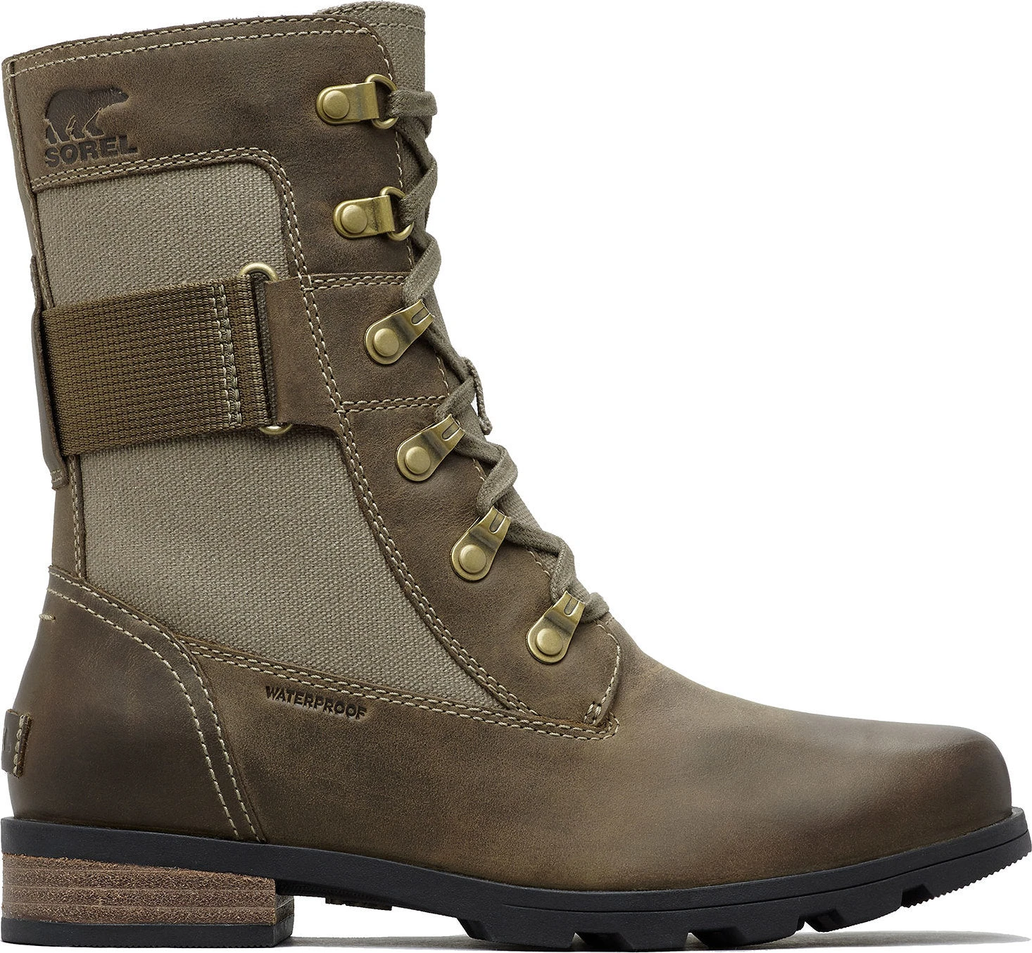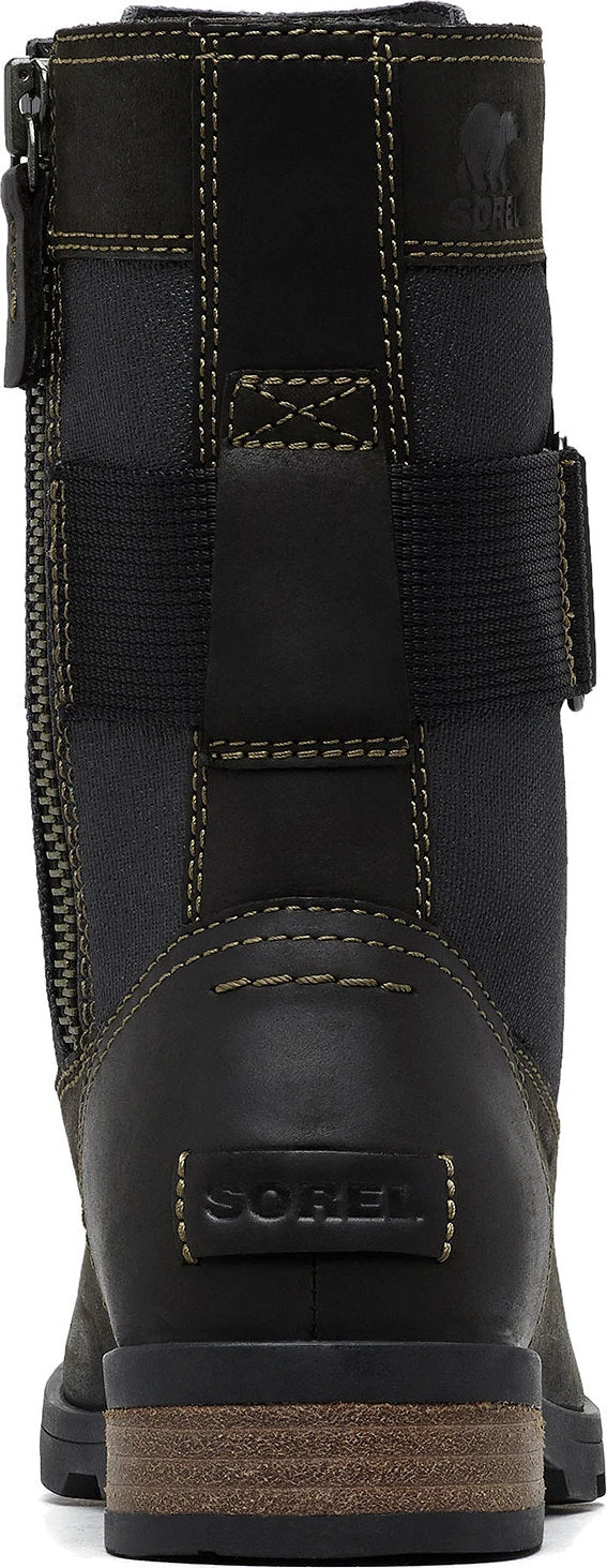 The womenâs EMILIE Conquest Boot is a performing wet-weather protector that sacrifices nothing in style or edge while getting to work or play in the rain. The waterproof upper of full grain leather and coated canvas gives contrast paneling and is fully seam-sealed against water. The lining is a canvas-synthetic blend. A removable die-cut memory EVA footbed provides cushion and comfort. A microfleece top cover ups the comfort level further. A rubber midsole and molded rubber outsole give sturdiness and traction. The block heel is leather-wrapped. Brass hardware and buckle details lend an edge to the boot.