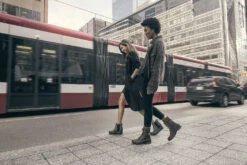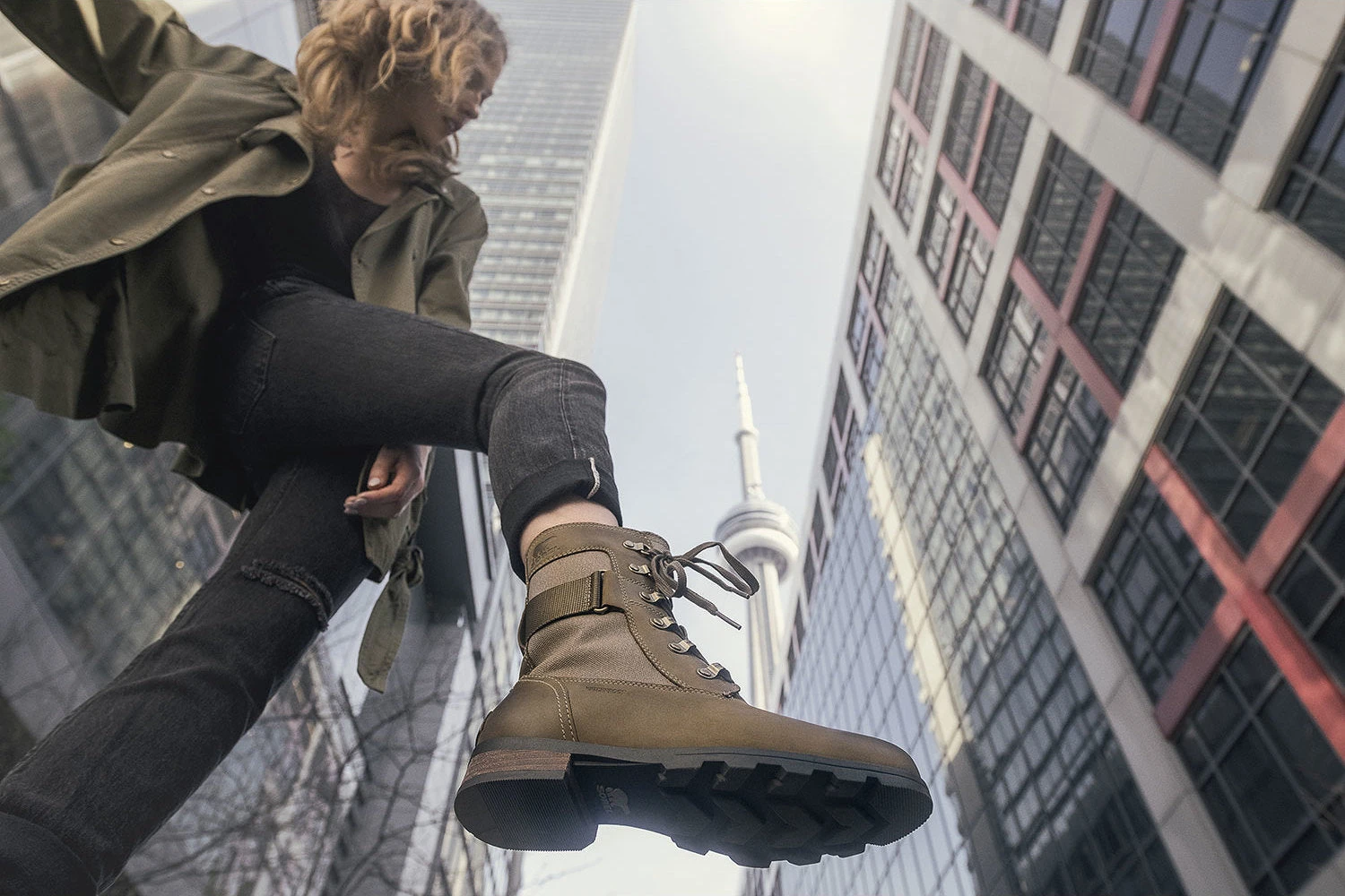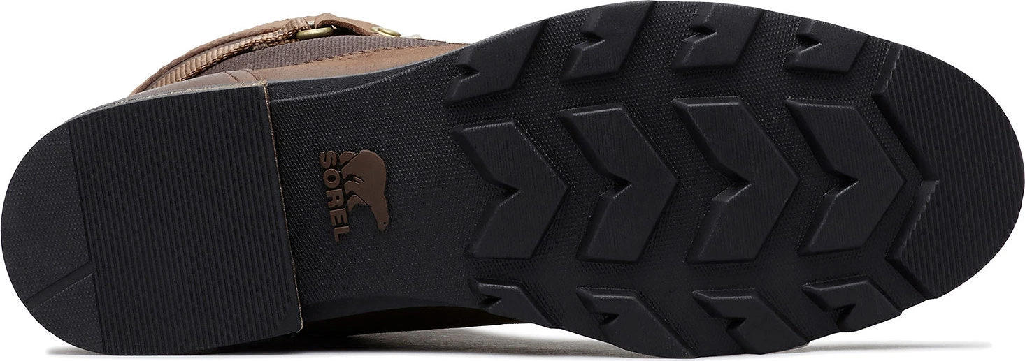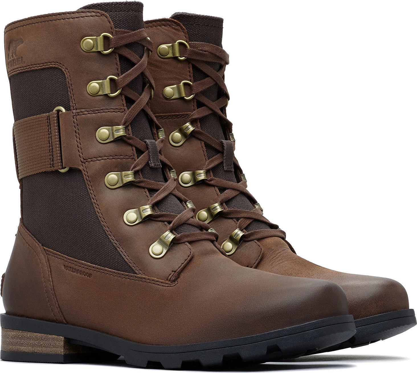 The womenâs EMILIE Conquest Boot is a performing wet-weather protector that sacrifices nothing in style or edge while getting to work or play in the rain. The waterproof upper of full grain leather and coated canvas gives contrast paneling and is fully seam-sealed against water. The lining is a canvas-synthetic blend. A removable die-cut memory EVA footbed provides cushion and comfort. A microfleece top cover ups the comfort level further. A rubber midsole and molded rubber outsole give sturdiness and traction. The block heel is leather-wrapped. Brass hardware and buckle details lend an edge to the boot.