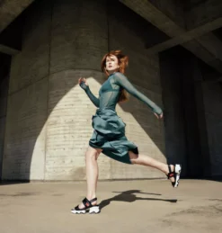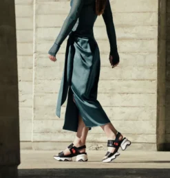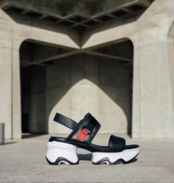 - UPPER: Secure leather forefoot strap. Adjustable hook and loop mesh midfoot strap with leather overlay and d-ring webbing detail. Leather strap around heel or webbing strap with screenprint.